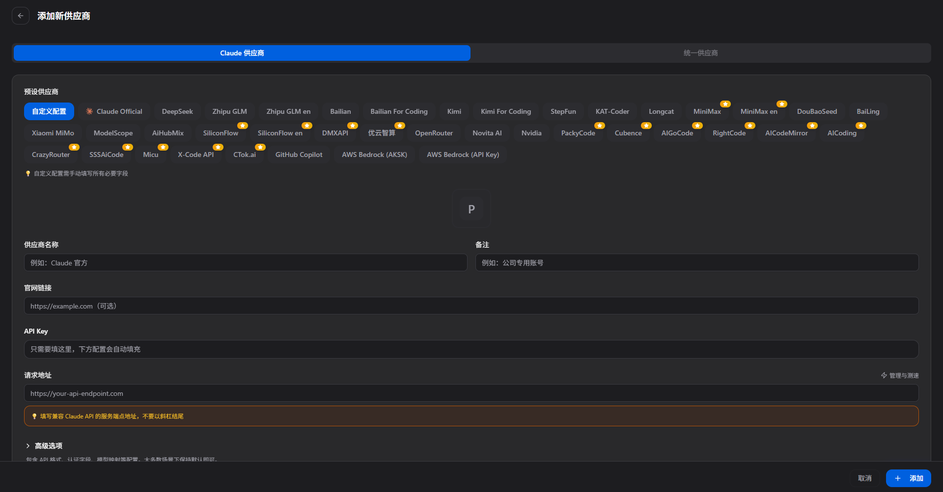 - 点击「添加供应商」,从预设列表中选择或自定义配置,填入 API Key